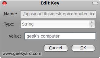While you are there, you can also tinker with the names. If for example, you want to change the name from “Computer” to “Geekyard Computer”, all you have to do is double-click on computer_icon_name, choose String as the type and then key in the name you want to give to it.