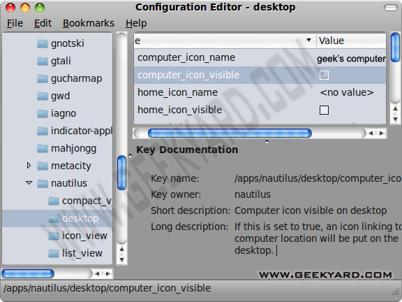 That’s it! You can customize what to show up on your desktop easily. While you are there, you might look into other options with gconf-editor, it provides an explanation of every option that you select, so you know what you are about to do. In case something goes wrong you can always correct it via the editor or by using the gconftool2 command within the terminal.